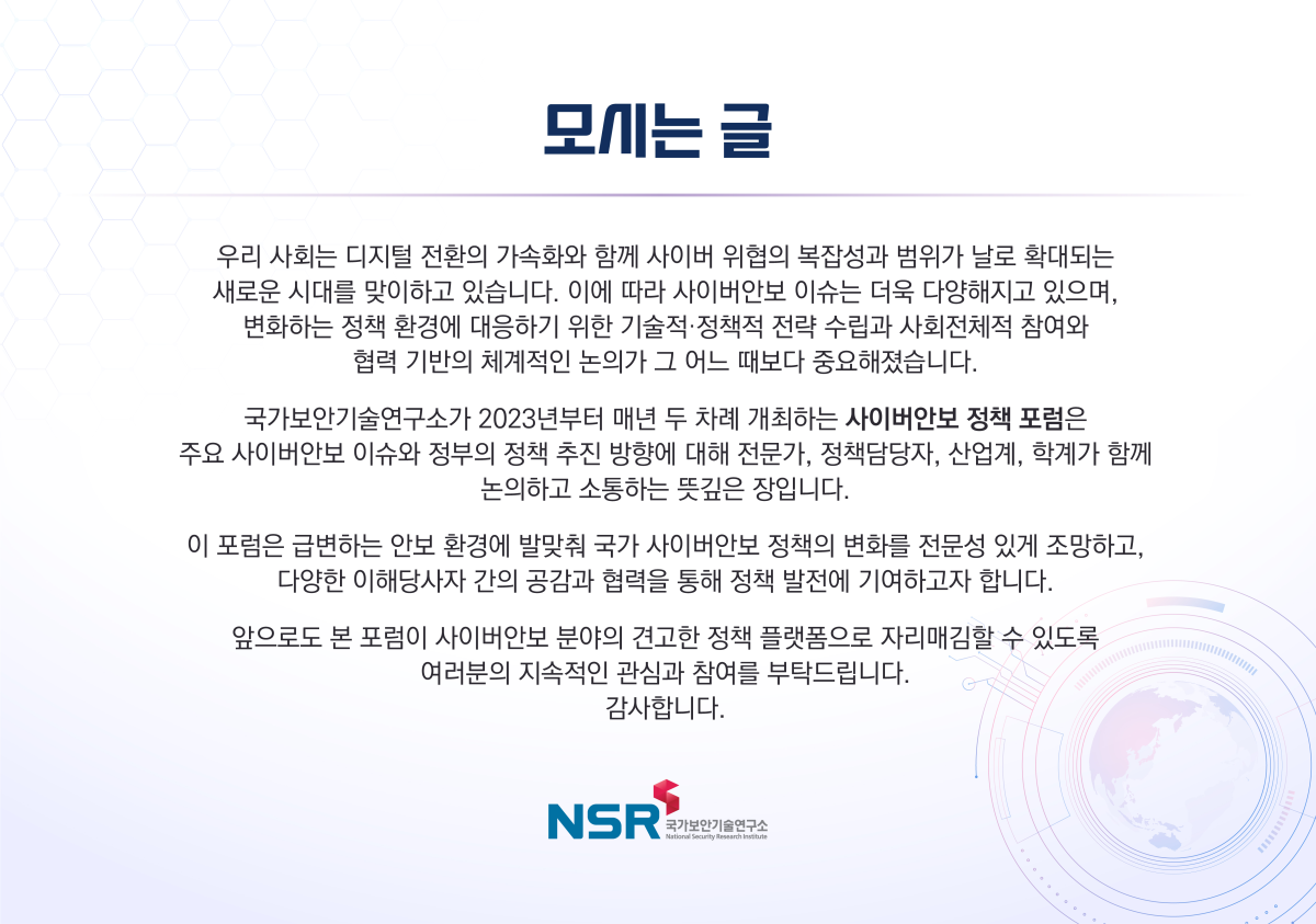 ‘사이버안보 정책 포럼 운영사무국’은 이용자에게 개별적인 맞춤서비스를 제공하기 위해 이용정보를 저장하고 수시로 불러오는 ‘쿠키(cookie)’를 사용하지 않습니다.